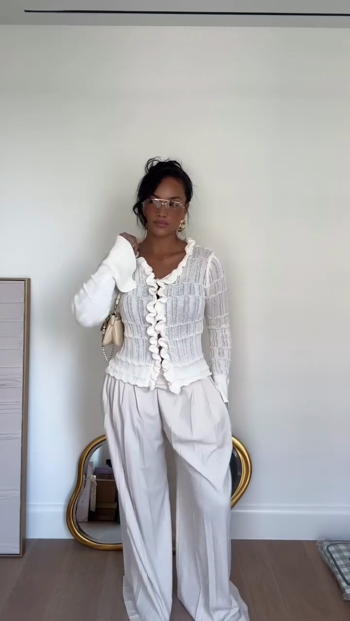 Elevate your casual - chic wardrobe with this White Ruffled Crochet Cardigan & Wide - Leg Pants Set. The crochet cardigan features delicate ruffles and a fitted silhouette, paired with flowy wide - leg pants for a balanced, stylish look. Perfect for brunch, shopping, or relaxed outings, accessorize with a small tote and minimalist jewelry.