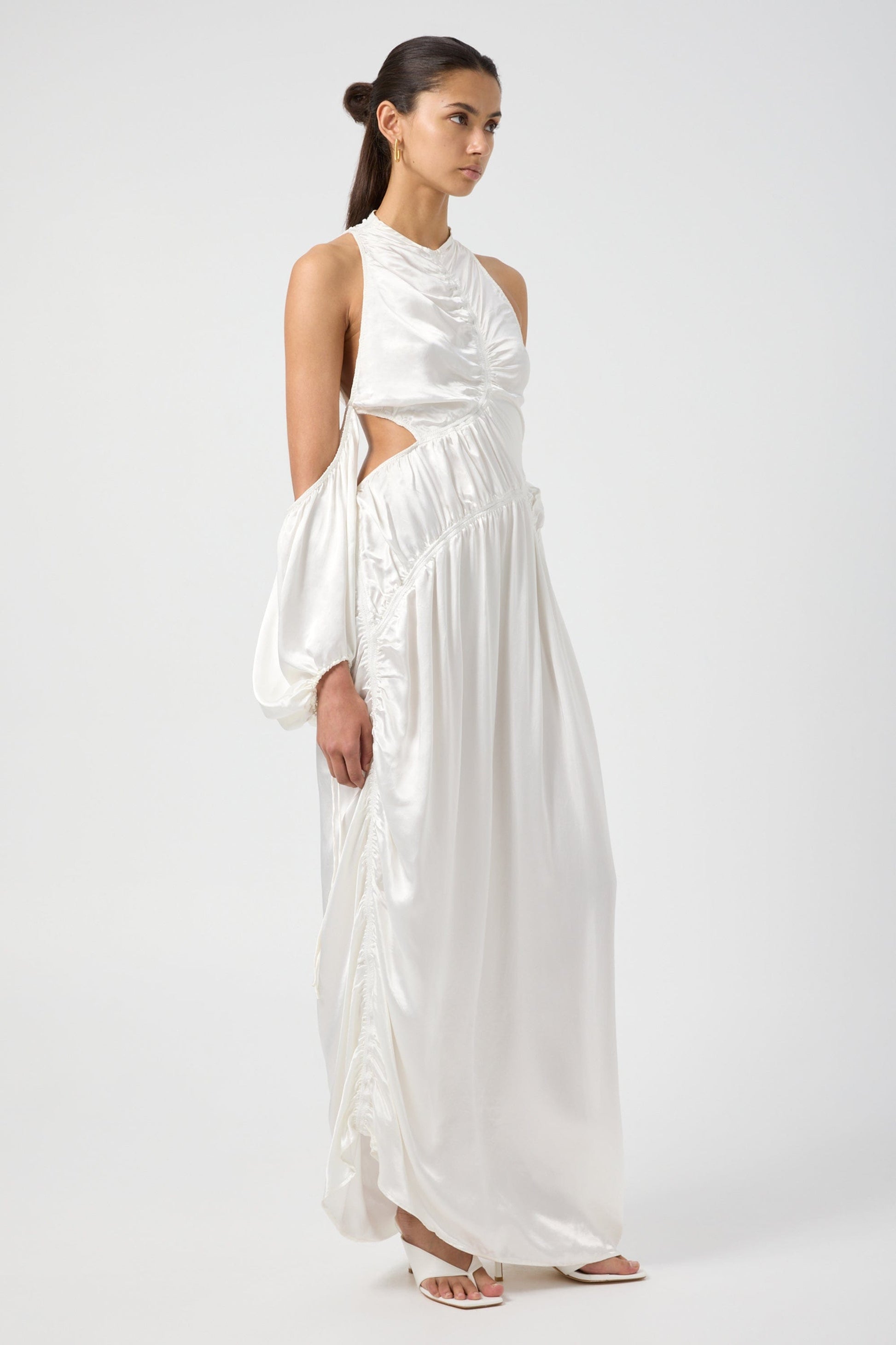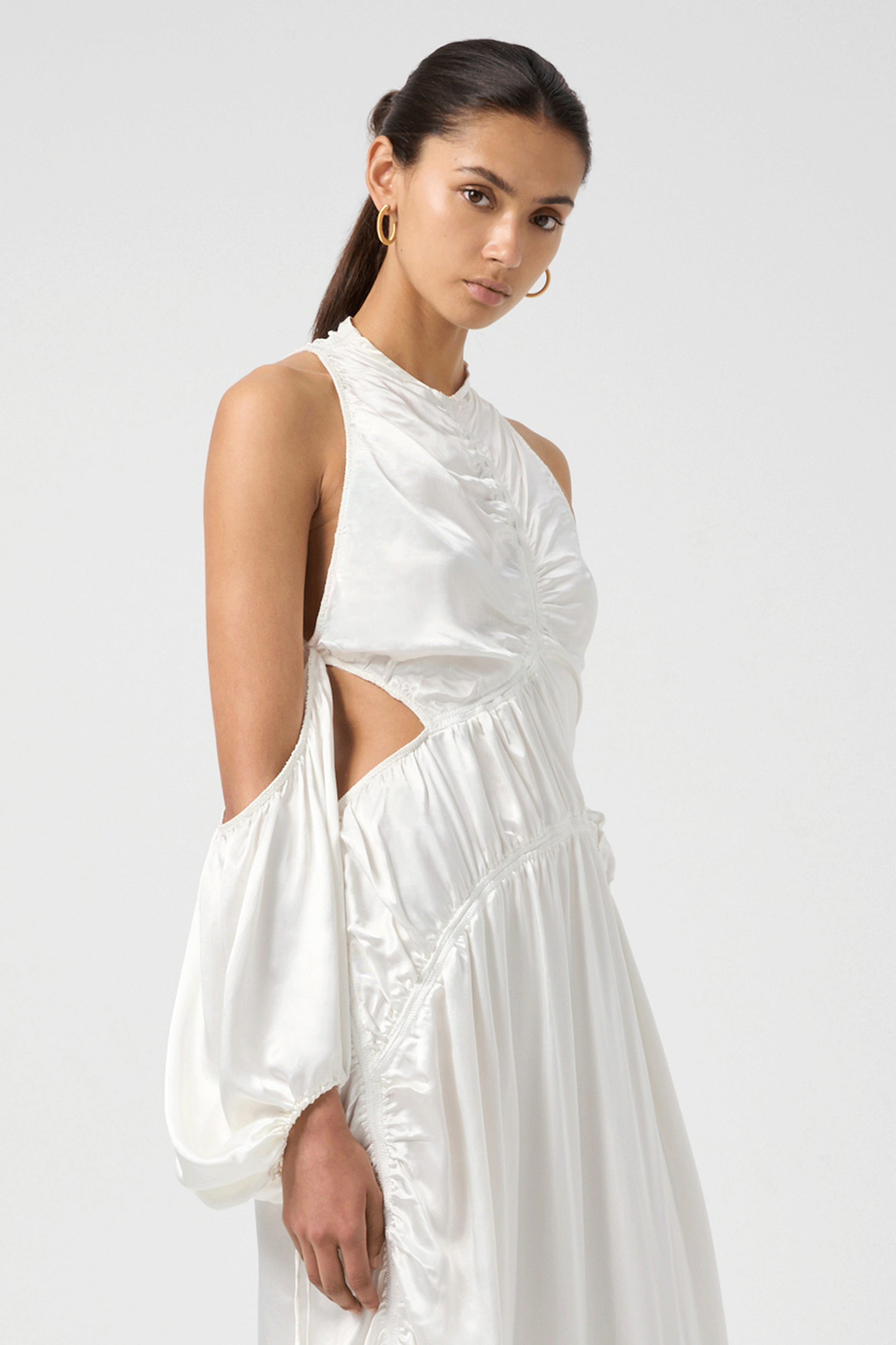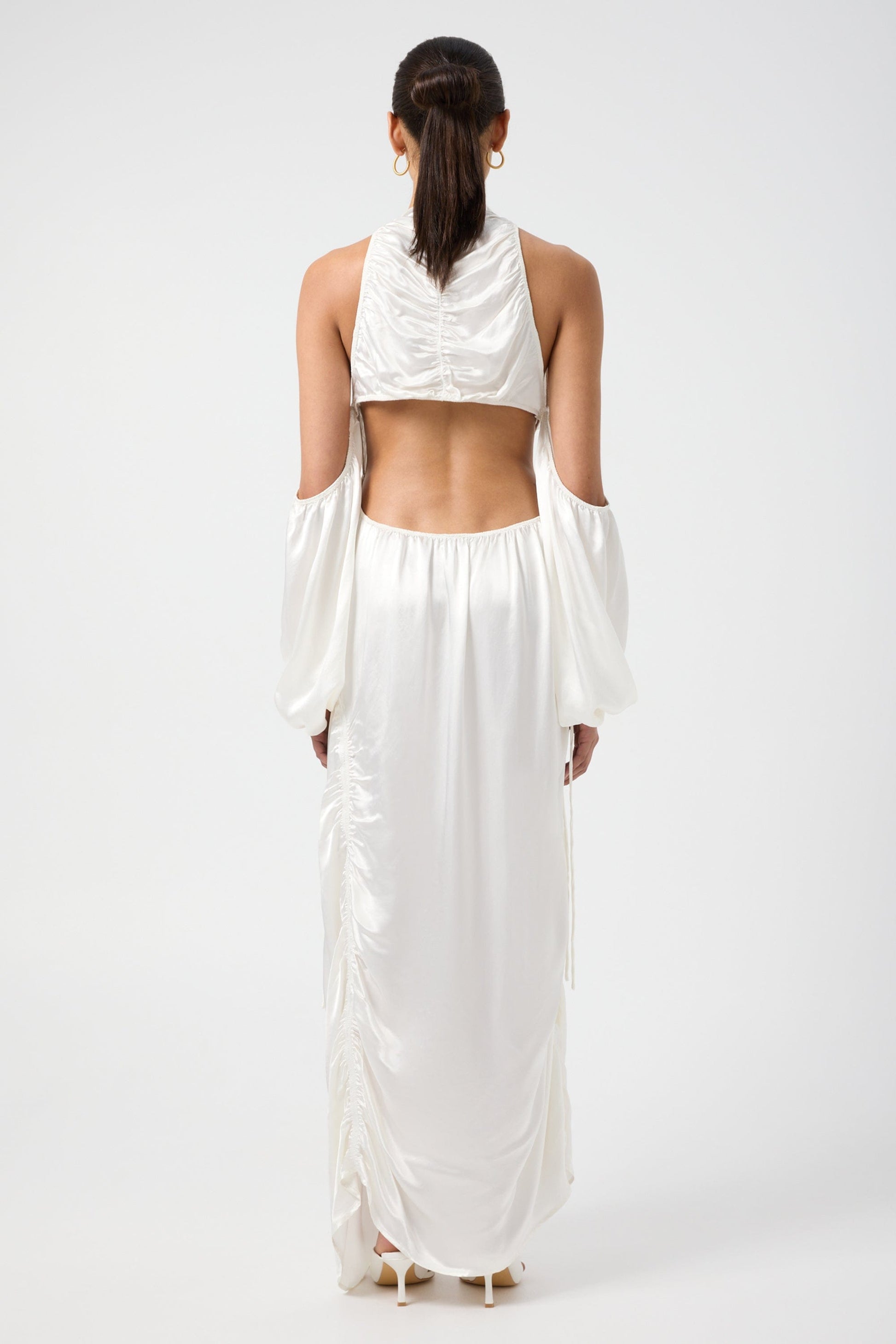 Elevate your elegant wardrobe with this White Satin Open Back Long Sleeve Dress. The halter neckline, ruched bodice, and unique cut - out sleeves create a sophisticated, fashion - forward look. Perfect for formal events, weddings, or upscale gatherings. Pair with minimalist heels and delicate jewelry to complete the refined ensemble.