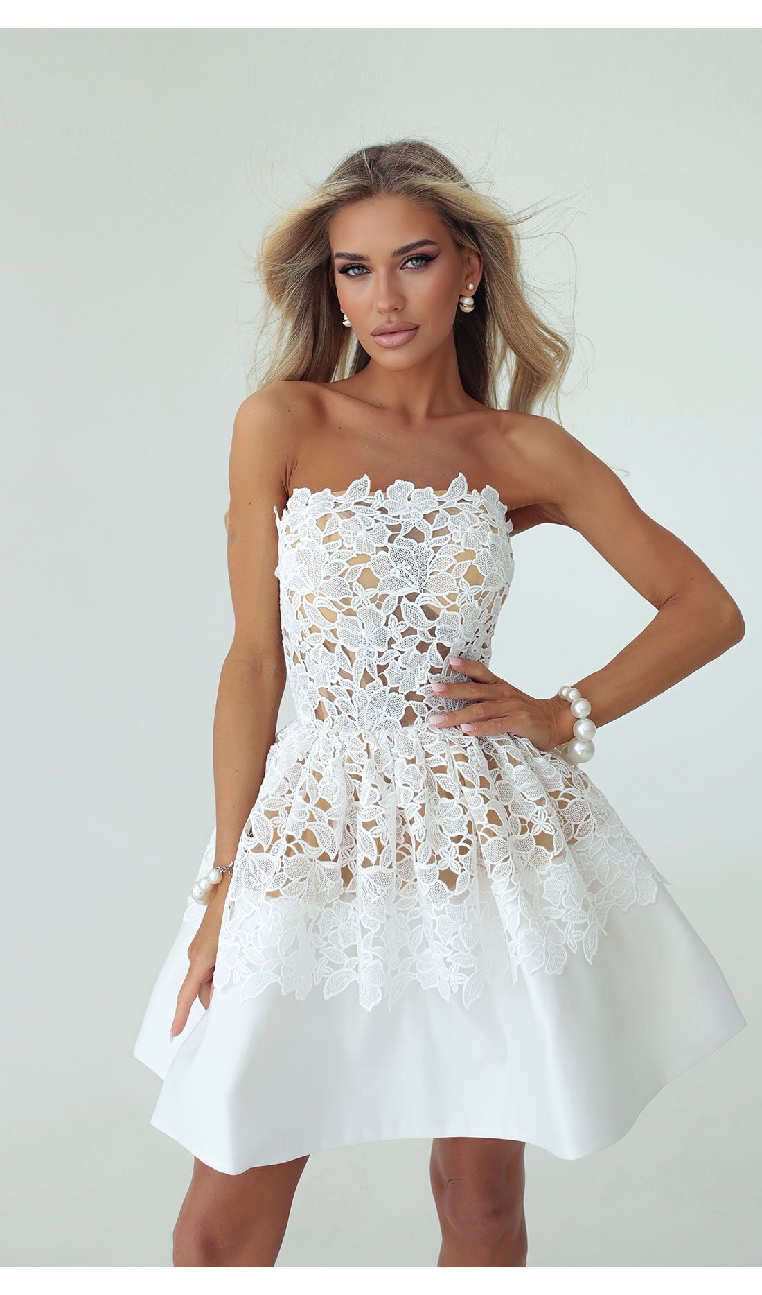 Elevate your elegant wardrobe with this White Strapless Lace - Overlay Mini Dress. The intricate lace detailing, strapless design, and flared skirt create a feminine, sophisticated look. Perfect for formal events, weddings, or special occasions. Pair with delicate heels and pearl jewelry to complete the timeless ensemble.