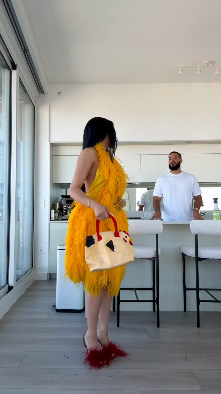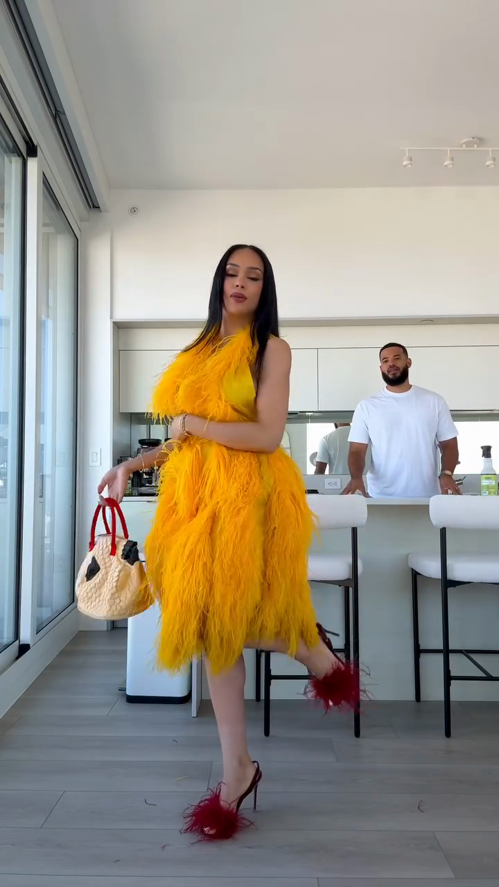 Elevate your wardrobe with this Yellow Feather - Trimmed Sleeveless Midi Dress. The luxurious feather detailing, sleeveless design, and midi length create a glamorous, eye - catching look. Perfect for special events, parties, or nights out. Pair with bold accessories and high - heels to complete the sophisticated ensemble.