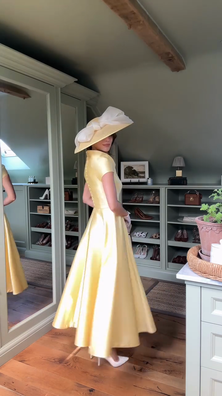 Elevate your formal event or race day wardrobe with this Yellow Satin V - Neck Maxi Dress . The luxurious satin fabric, V - neckline, and coordinated fascinator create a chic, elegant look. Perfect for weddings, galas, or high - society events. Pair with gloves and a small clutch to complete the effortlessly sophisticated ensemble.